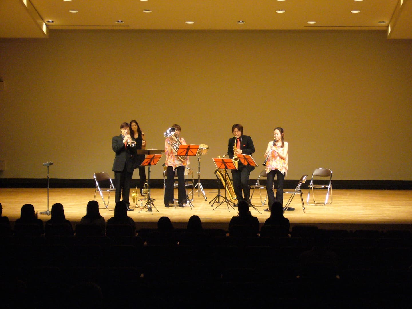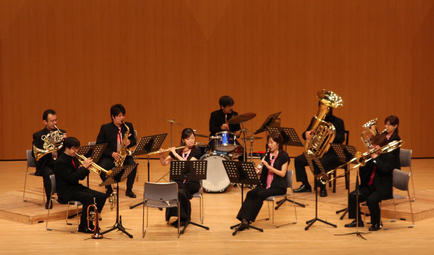 基本的には金管アンサンブル(トランペット2、ホルン、トロンボーン、テューバ)ですが、タンバリンやカホン、ティンバレス、ドラムなどのパーカッションと持ち替えてルネサンス音楽、バロック音楽からポップスまで演奏します。最近では、金管5重奏と吹奏楽のためにアレンジされた曲も増え、一般バンドとの共演も行なっています。